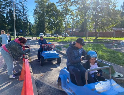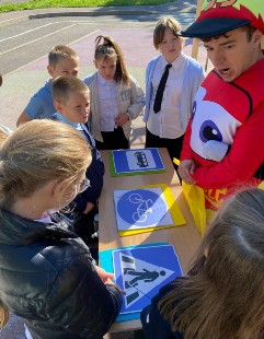 Необходимо было правильно проехать на самокате по дороге со знаками и светофором, ответить на непростые вопросы, собрать из отдельных кусочков дорожные знаки.